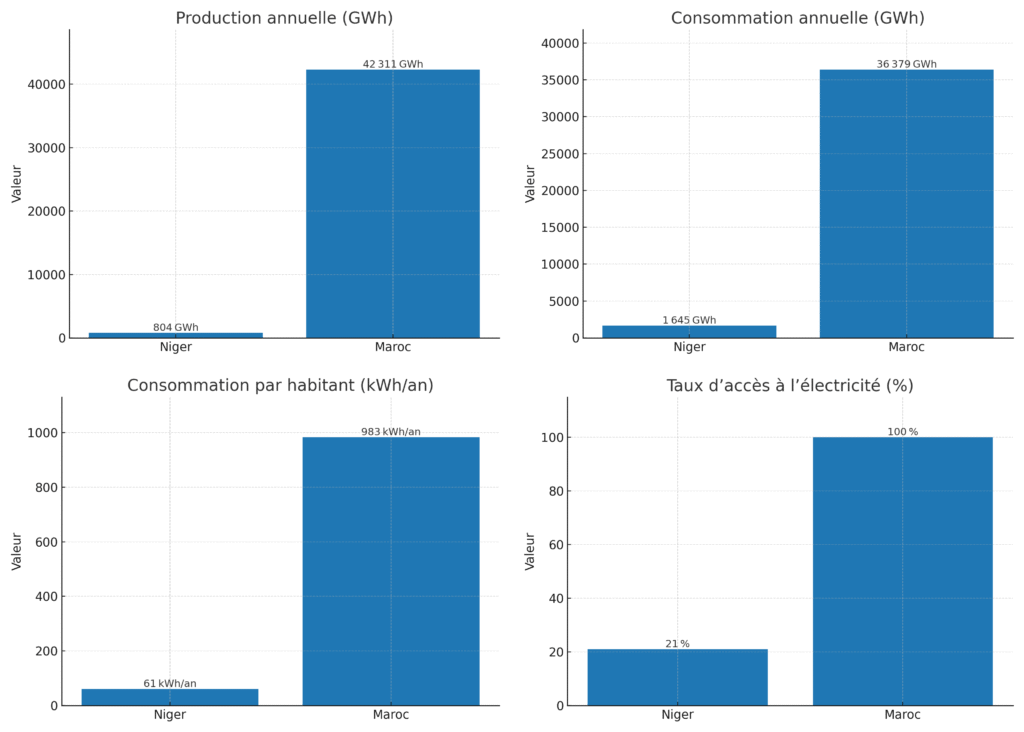 À titre de comparaison, la France produit chaque année un peu plus de 500 TWh d’électricité (données AIE / ONU). Autrement dit, en un an, le Niger produit ce que la France génère en environ deux heures.